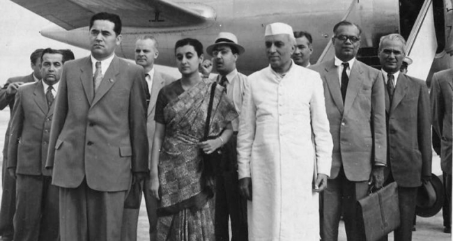 Nuriddin Muhitdinov (ön sıra, soldan birinci), Özbekistan'a gelen Hint lideri Cevahirlal Nehru ve kızı Indra Gandhi ile birlikte. 1955