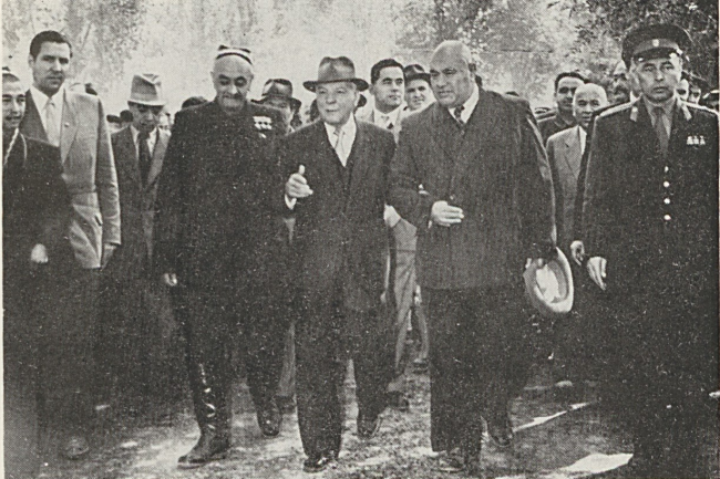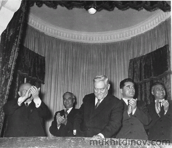 Özbekistan'ın birçok lideri tek fotoğrafta. Soldan sağa: SSCB lideri Nikita Kruşçev, Amin Niyazov (arkada), SSCB Savunma Bakanı Nikolai Bulganin, Nuriddin Muhitdinov ve Sharof Rashidov