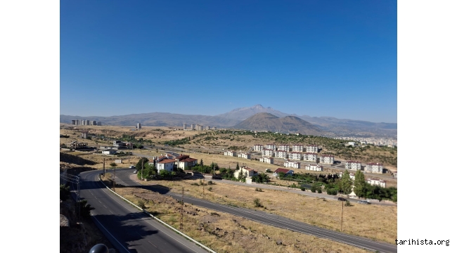Kayseri çok geniş bir düzlüğe kurulu. Güney ve güneybatıda şehre bitişik orta büyüklükte iki dağ; yakındaki Ali dağı volkanik olduğu tepesindeki düzgün kavisli çukurluktan anlaşılıyor. Uzak arka planda Temmuz sonlarında bile kuzey yüzünde kar veya buzul görülen bir yüce dağ; Erciyes dağı da sönmüş volkanik bir dağ. Orta Anadolu’nun en yüksek yeri. 20-30 milyon yıl önce bölge bir deniz ve yerküredeki çatlaklardan çıkan lavların soğuması ile çok uzun yıllarda oluşmuş. Erciyes’in en son MÖ. 253 yılında lav püskürdüğü düşünülüyor. Batıda, çatallı görünümü ile Yılanlı dağı. Düz olan şehir gün ortasında sıcak. Misafir olduğumuz ev, şehrin doğusunda, şehre hâkim bir tepede; güzel, şehir ve Erciyes manzaralı, gündüz dahi hafif serinleten rüzgârı var.