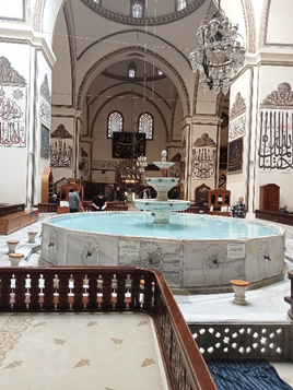 Ulu Cami'nin içindeki havuz üstündeki kubbe başlangıçta açık olarak yapılmıştır. Telle örülü bu kısımdan giren yağmur damlaları altındaki havuzda toplanır ve gün ışığı camiyi aydınlatırmış. Günümüzde bu kısım camla kaplanmıştır. Yağmur suyu havuzda birikmese de cami gün ışığından yaralanabilmektedir. Şadırvanın yapılmasıyla ilgili bir de rivayet söz konusudur ki o da şöyledir: Ulu Cami yapılırken şadırvanın bulunduğu yerdeki toprak parçasını bir hanım satmak istememiştir. Uzun yıllar sonra arazisini vermeye razı olmuş, ancak daha sonraları bu şekilde alınan bir yerde namaz kılınmaz düşüncesiyle buraya bir şadırvan yapılmıştır.