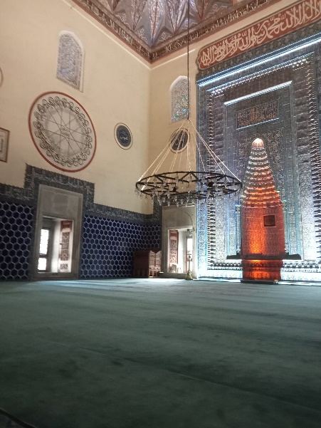 Caminin ortasında bir şadırvan bulunmakla birlikte camii giriş kapısı üzerinde ‘’Ahi Bayazit oğlu Ahi İvaz Paşa’nın Çelebi Sultan Mehmed’in emriyle bu caminin planını çizip, ölçüleri tespit ettiği ve süslerini ısmarladığı yazlıdır.’’ Camii içindeki çiniler üç metre yüksekliğe çıkar, koyu yeşil, açık ve koyu mavi renklerdedir.