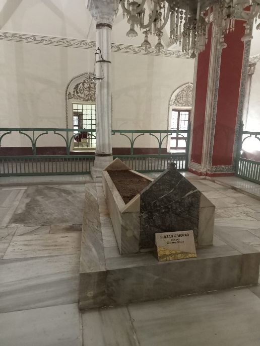 Gösterişten hoşlanmayan II. Murad’ın türbesi son derece sadedir. Türbenin kubbesi II. Murad’ın vasiyeti gereği, mezarın yağmur sularıyla ıslanması için açık olarak yapılmıştır. II. Murad’ın türbesinin içinden geçilerek girilen odada II. Murad’ın oğlu Alaaddin ve kızları Fatma ve Hatice Sultanların sandukaları bulunmaktadır. II. Murad’ın Türbesi, külliyenin merkezinde, camiinin güneybatısındadır. II. Murad 1451 yılında Edirne’de hayatını kaybetmiştir. Vasiyeti gereği büyük oğlu Alaaddin’in mezarı yakınında olmak istediğinden cenazesi Bursa’ya getirilmiş ve Fatih Sultan Mehmed tarafından yaptırılan Muradiye Külliyesi içindeki türbeye defnolunmuştur.[3]