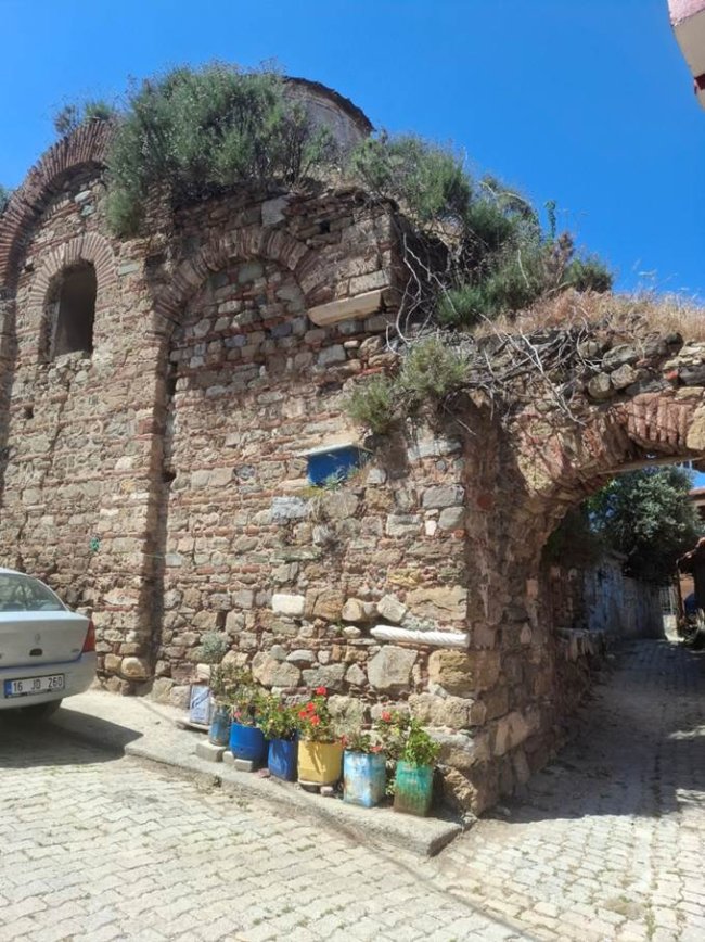 Kemerli Kilise (Panagia Pantobasilissa): Trilye’de bulunan en özgün ve tarihsel değeri yüksek dini yapılardan biridir. Yunanca adı ‘Tüm Kraliçelerin Meryem’i’ anlamına gelen bu kilise, Ortodoks geleneğinde Bakire Meryem’e adanmış sayılı mekânlardan biri olarak kabul edilir. Kilise, mimari tarzı, kullanılan duvar örme teknikleri ve genel planlaması göz önünde bulundurularak 13. yüzyıl sonlarına tarihlendirilir. Bu dönemde Trilye, Bizans idaresi altında bulunan bir kıyı yerleşimiydi ve bölgedeki Rum-Ortodoks nüfusun ruhani merkez ihtiyacını karşılayan bu yapı, cemaatin sosyal ve kültürel birliğini sağlayan bir odak noktası işlevi görmüştür. Yapının en erken dönemine ait ilk fresk tabakası, 14. yüzyılın başlarına tarihlenmektedir. Bu freskler, hem sanatsal hem de teolojik açıdan değerli örneklerdir. Zamanla tahrip olan bu tabakanın üzerine, 1723 yılında ikinci bir fresk katmanı eklenmiştir. Bu ikinci katman, kilisenin 18. yüzyılda hâlâ aktif ve bakımlı bir ibadet yeri olduğunu gösterir. Osmanlı döneminde, gayrimüslim cemaatlerin ibadet haklarının sürdüğü çerçevede kilise işlevini sürdürmüştür. Ancak 1924 mübadelesiyle birlikte Trilye'deki Rum-Ortodoks nüfusun Yunanistan’a gönderilmesiyle, yapı ibadet işlevini kaybetmiş; zamanla kullanılmaz hâle gelmiştir. Uzun yıllar boyunca bakımsız kalan yapı, hem doğal etkenlerle hem de insan eliyle tahribata uğramıştır. Yakın zamanda kilise, İstanbul Fener Rum Patrikhanesi tarafından Bursa Metropolitliği’ne atanan Elpidophoros Lambriniadis tarafından satın alınmıştır. Yapının, özgün yapısına sadık kalınarak restore edilmesi ve tekrar kilise olarak kullanılmak üzere hizmete açılması planlanmaktadır.