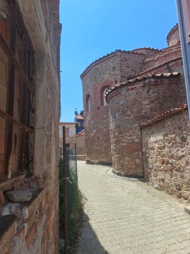 Fatih Camii (Aya Todori - Hagios Stephanos Kilisesi): Bir yapının hem kilise hem cami olarak geçmişi taşımış olması, tarihî katmanların bir arada nasıl var olabileceğinin güçlü bir örneğidir. Bazı yapılar şekil değiştirir ama yok olmaz. Onlar, zamanın akışına kapılmak yerine, zamanla birlikte yaşamayı seçer. Fatih Camii bu türden bir yapıdır. 7. yüzyıldan bugüne gelen bu yapı, bir bina olmaktan çok, bir hatırlayış biçimidir. Aya Todori adıyla başlayan varoluşu, Hagios Stephanos’a adanarak genişletilmiş, daha sonra minaresiyle, mihrabıyla yeni bir anlam yüklenmiş. Fakat her değişimde özüyle bağını koparmamıştır. 1560’ta bir camiye dönüşmüş olması, bir devam etme biçimidir. Yanına inşa edilen Avlulu Hamam da bu sürekliliğin bir uzantısıdır. Temizlikle kutsallık, suyla zaman arasında kurulan bağın mimari yansımasıdır. Dış cephedeki Bizans işçiliğiyle, iç mekândaki Osmanlı estetiği arasındaki karşılaşma, mimari ve kültürel bir buluşmadır. Minber ve mihrap gibi unsurların yapıya sonradan eklenmesi, bu uyumun zarafetle gerçekleştiğini gösterir. Fresklerden geriye kalan izler, farklı inançların aynı duvarlarda iz bırakabildiğini hatırlatır.