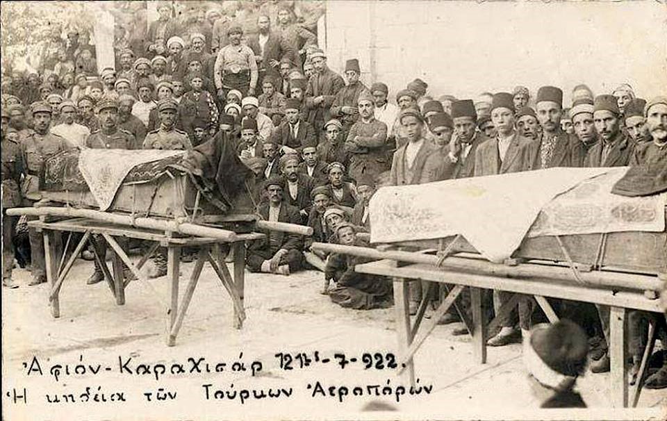 Cenaze töreni Afyon Mevlevihanesi önünde yapılır. Sonradan Afyonkarahisarlı Çavuş Ahmet tarafından esir alınacak olan Yunan ordusunun bölgedeki Başkomutanı Trikopis anılarında bu olayı şöyle anlatır. “Uçak ateşler içinde ve subaylar kömür halinde Afyon yakınındaki hatlarımızın içine düştü. Derhal bunların defnedilmesini ve bir taburumuzun ihtiram (saygı, hürmet) görevini yerine getirmesini emrettim. Bu merasimde ben de hazır bulundum ve bu hareketimiz Afyon'daki Türkler arasında büyük memnuniyet uyandırdı. Arkadaşlardan bazıları Türklere karşı gösterilen bu saygıya hayret etti. Onlara buraya bizim kendimizin geldiğini, ölülerle değil canlı ve silahlı kişilerle savaştığımızı ve ölenlerin de vatanları için çalışıp görevlerini yaptıklarını anlattım.”