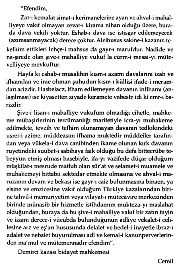 Manisa bölgesinde kullanılan ilginç ağızlardan biri de Demirci de kullanılanıdır. Bugün yazımıza Demirci’de 1923 yılında görev yapan hâkim Cemil Bey’in bir dilekçesini misafir edeceğiz. Konu Avram Galanti’nin “Türklük İncelemeleri” isimli kitabında geçmektedir. Demirci’ye hâkim olarak atanan Cemil Bey, mahkemelerde davalı ve davacıların konuşmalarını anlamadığı için ve davalarda hatalı karar vermemek için mübaşirleri tercüman olarak kullanıyor. Daha sonra da bu tercüman vasıtası ile yapılan işlerden tatmin olmadığından başka bir yere tayinini istiyor. Demirci’ye de mahalli lisanı bilen birilerinin atanmasının son derece önemli olduğundan bahsediyor.