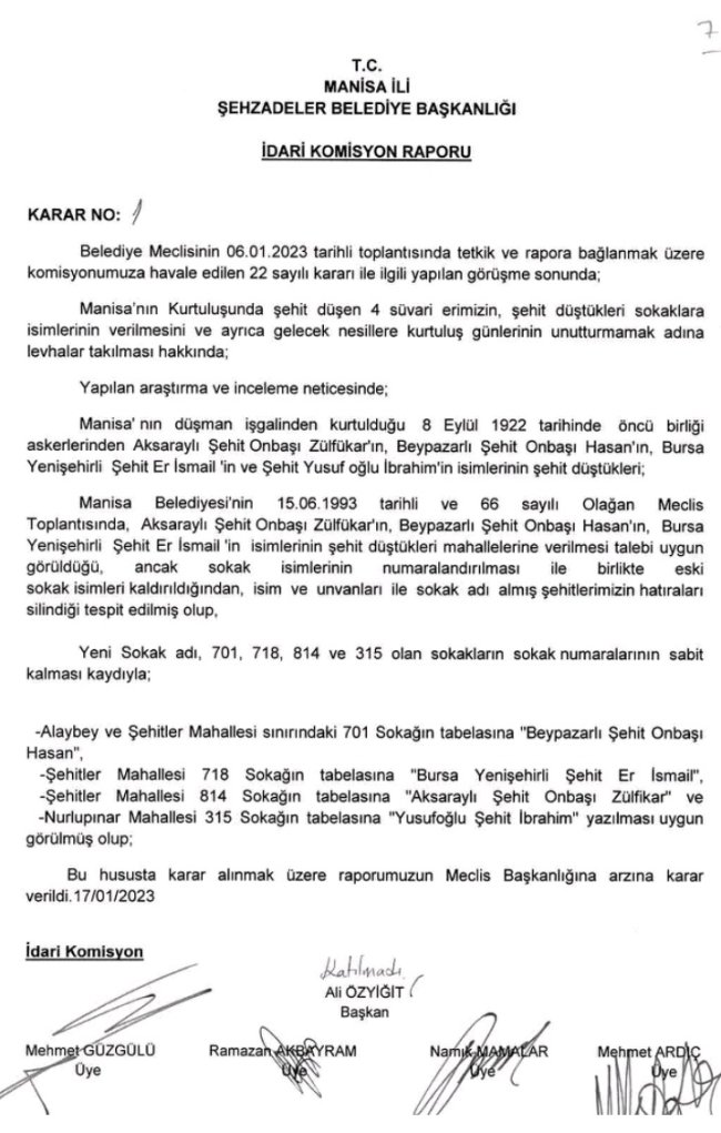 Ocak ayında komisyonca hazırlanan rapor Meclis Başkanlığına arz edildi. Meclisin Şubat ayında yaptığı toplantıda 4 şehidimizin isminin, şehit oldukları bölgedeki sokaklarda yaşatılmasına karar verildi (32 numaralı karar).