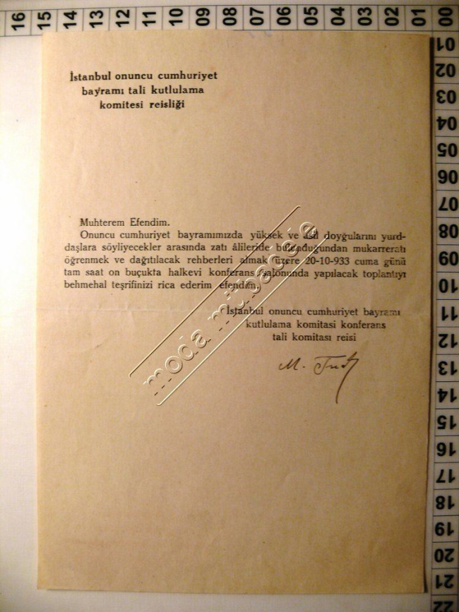 1933: Muhterem Efendim, Onuncu cumhuriyet bayramımızda yüksek ve asil duygularını yurddaşlara söyliyecekler arasında zatı alileride bulunduğundan mukareeatı öğrenmek ve dağıtılacak rehberleri almak üzere 20-10-933 Cuma günü tam saat on buçukta halkevi konferans salonunda yapılacak toplantıyı behmehal teşrifinizi rica ederim efendim. İstanbul onuncu cumhuriyet bayramı kutlulama komitası konferans tali komitası reisi