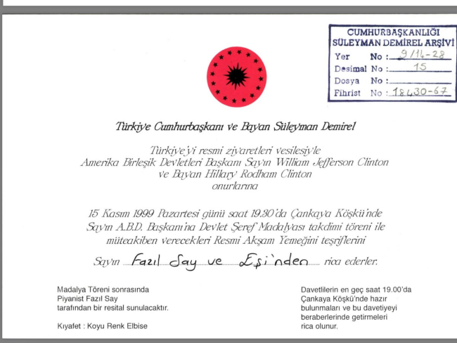 1999: Türkiye Cumhurbaşkanı ve Bayan Süleyman Demirel Türkiye’yi resmi ziyaretleri vesilesiyle Amerika Birleşik Devletleri Başkanı Sayın William Jefferson Clinton ve Bayan Hillary Rodham Clinton onurlarına 15 Kasım 1999 Pazartesi günü saat 19.30’da Çankaya Köşkü’nde Sayın A.B.D. Başkanı’na Devlet Şeref Madalyası takdimi töreni ile müteakiben verecekleri Resmi Akşam Yemeğini teşriflerini Sayın Fazıl Say ve Eşi’nden rica ederler. Madalya Töreni sonrasında Piyanist Fazıl Say tarafından bir resital sunulacaktır. Davetlilerin en geç saat 19.00’da Çankaya Köşkü’nde hazır bulunmaları ve bu davetiyeyi beraberlerinde getirmeleri rica olunur.