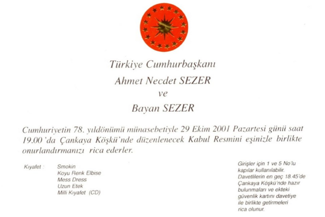 2001: Türkiye Cumhurbaşkanı Ahmet Necdet Sezer ve Bayan Sezer Cumhuriyetin 78. Yıldönümü münasebetiyle 29 Ekim 2001 Pazartesi günü saat 19.00’da Çankaya Köşkü’nde düzenlenecek olan Kabul Resmini eşinizle birlikte onurlandırmanızı rica ederler. Kıyafet : Smokin Koyu Renk Elbise Mess Dress Uzun Etek Milli Kıyafet (CD) Girişler için 1 ve 5 No’lu kapılar kullanılabilir. Davetlilerin en geç 18.45’de Çankaya Köşkü’nde hazır bulunmaları ve ekteki güvenlik kartını davetiye ile birlikte getirmeleri rica olunur.