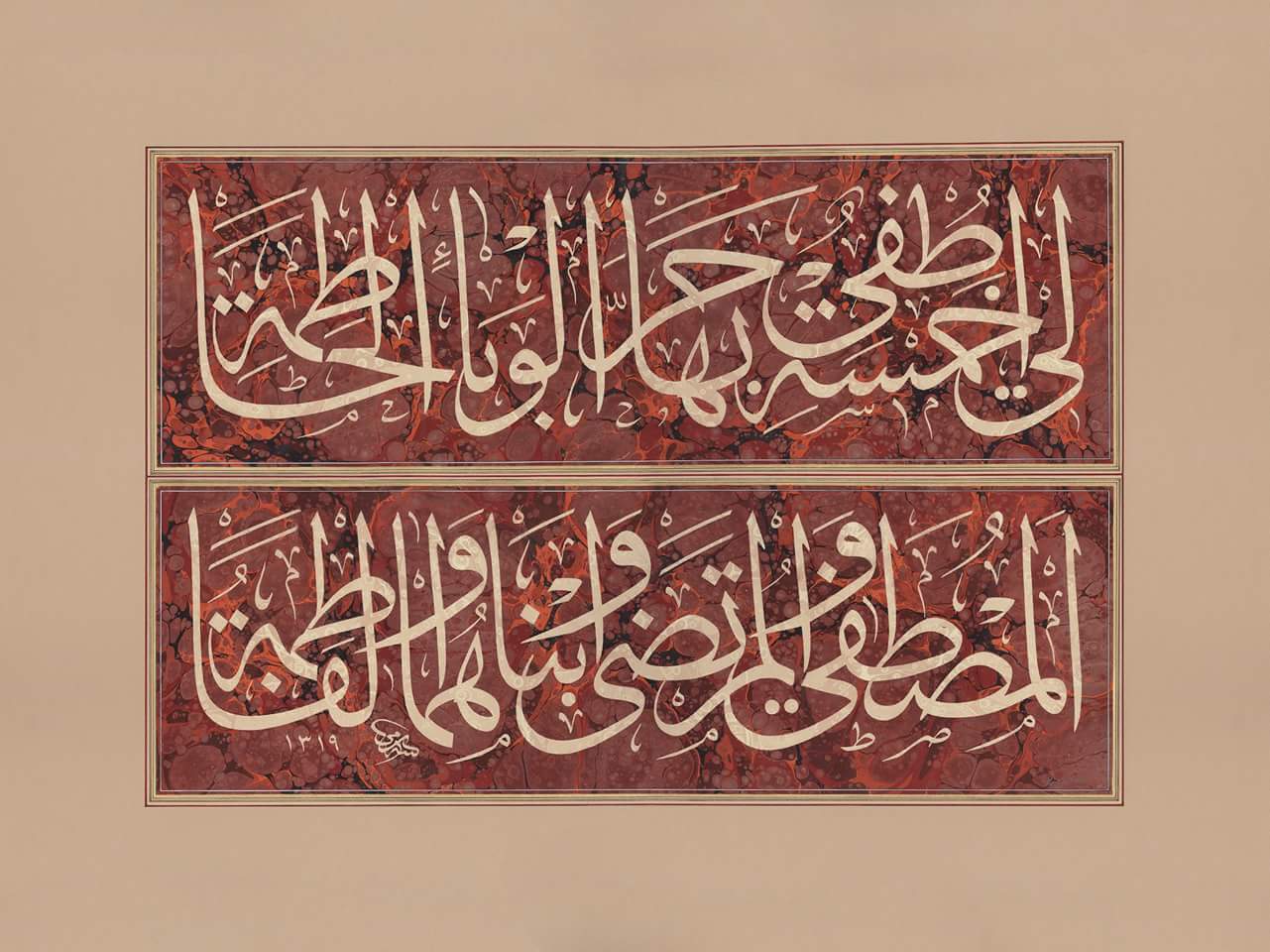 “Liy hamsetün utfiy bihâ harra’l-vebâ’i’l-hâtıme / el-Mustafâ ve’l-Murtezâve’b-nâhümâ ve’l-Fâtıme”