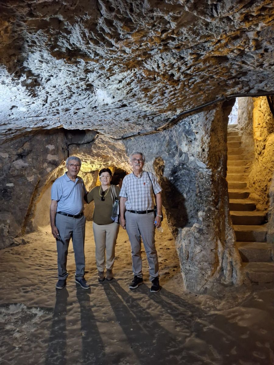 Buraya kadar gelmişken Derinkuyu görülmeden olmaz diyor. Nevşehir üzerinden bir saati aşan bir yolculuktan sonra menzile varıyoruz. Düz bir alanda etrafı çevrelenmiş, Kültür ve Turizm Bakanlığına ait tek katlı binalardan giriş için bilet alıyoruz. 65 yaş ve üzeri ücretsiz. Girişte bir yazı: Astım ve kalp hastaları giremez. Onun dışında bir rehber yok. İçerisi daha önce hiç girmemiş olanların kaygı, korku yaşayabilecekler yeraltı tünellerinden oluşuyor. Aydınlatma ve havalandırma iyi. Kırmızı Oklar ile ilerliyoruz. Ama birçok yerde ancak iki büklüm halde yürünebiliyor. Bir süre sonra her yer aynı deyip daha ileri gitmekten vazgeçiyor, dönelim diyoruz. Labirent gibi. Mavi bir okun dönüş yolu olabileceğini tahmin ederek yürüyor ve çıkışı buluyoruz. Belki okurlara yarar veya bürokratlardan birine bu eksiklikler ulaşır;