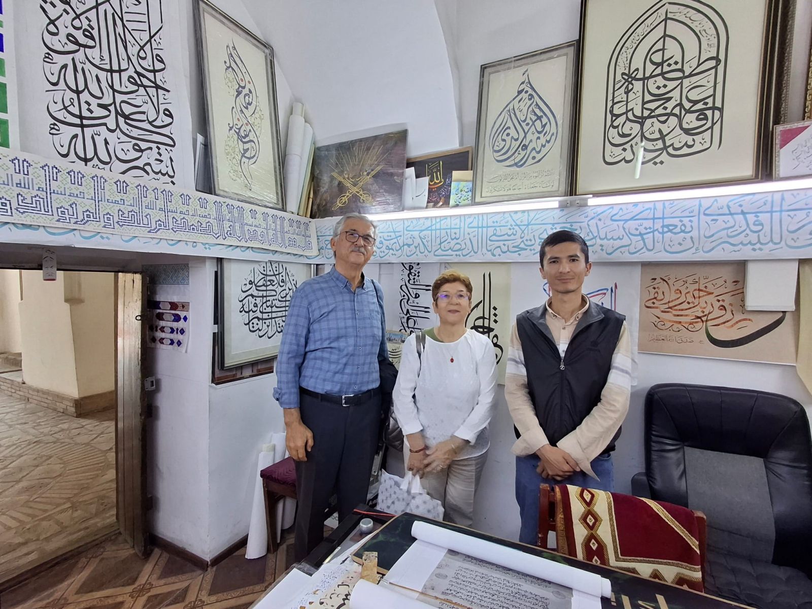 İndiğimiz yerde, köşede iki katlı içi dolu kırmızı tuğlalarla yapılmış, sıvasız (eski yapılarda sıva yok) tarihi bir bina. Duvarda Arap harfleri ile yazılı bir taş levha var. Eşim okuyor. Kökeldaş Medresesi. Merdivenlerden çıkıp açık ahşap kapıdan giriyoruz. Solda genç bir görevli. Giriş 15000 som (52 TL). Giriyoruz. Ortada yeşil geniş bir avlu, etrafta iki katlı, kapıları avluya bakan odalar. Hepsi kullanılıyor. Üst kata çıkmayı gösteren bir ok ve karşıda içinde insanların olduğu kapısı açık bir oda dikkatimizi çekiyor. İdari bir oda sandığımız yere başımızı uzatıp selam veriyor, burası nedir diye soruyoruz. Masada oturan genç Özbek, burası hattathane diyor. Merakımız artıyor. Önünde uzun rulo halinde Arap harfli bir metin var. Eşim birkaç satır okuyunca, siz bunları biliyorsunuz demek ki diyor. Kendisi hattat imiş, burada hat işleri yapıyor, öğrencilerine öğretiyormuş. 150 bin som’a (Özbekistan para birimi) bir hat yazısı alıyoruz. Seviniyor. Vedalaşıp dik merdivenlerden üst kata çıkıyoruz. Karşımızda bir başka hattat. Bu sefer başı örtülü genç bir bayan da hat yazıları ve fırça ile desenler yapıyor. Oradan da bir hat tablosu alıyoruz. Bu sanatın Türkiye dışında buralarda da yaşatılıyor olmasına seviniyoruz. Hat bizim sanatımız çünkü.