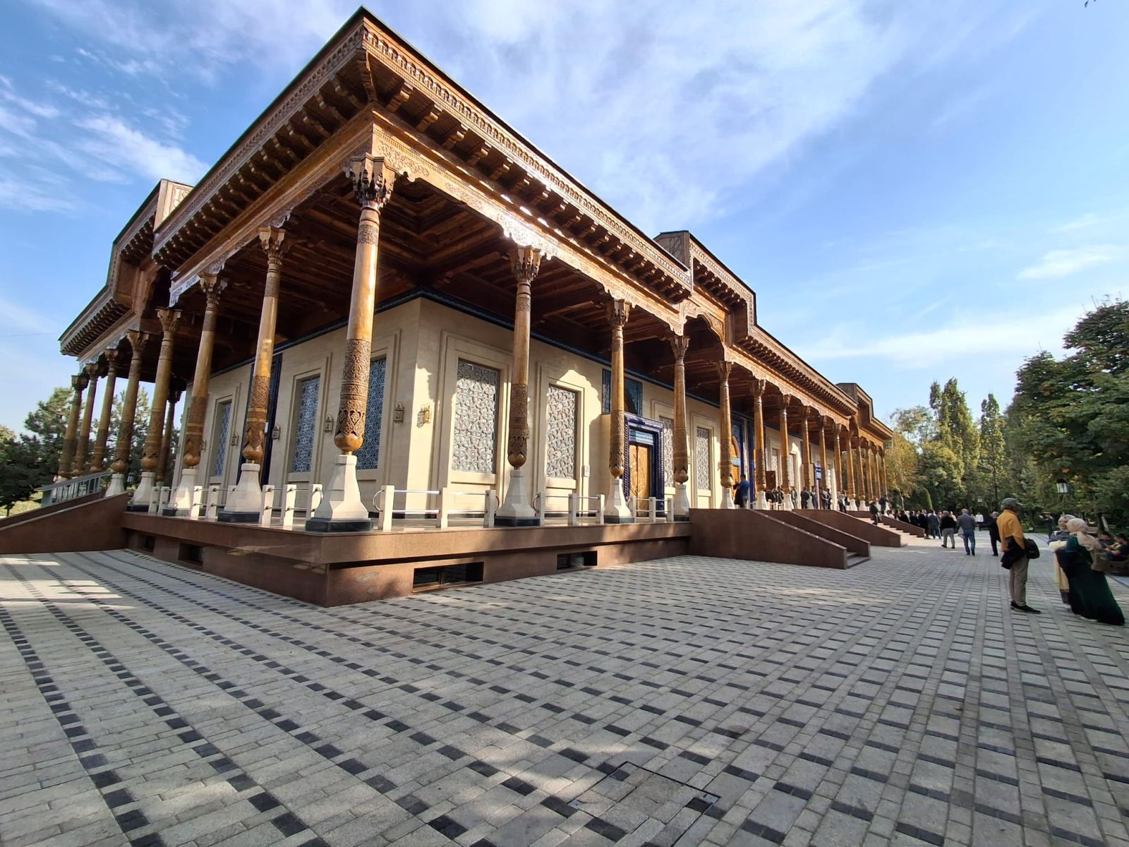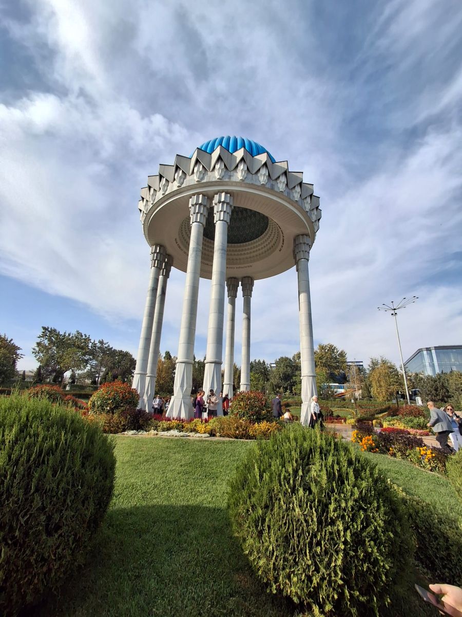 Yemekten sonra Taşkent’in önemli, tarihi bir yerine götürülüyoruz. Yeşil bir park içinde toplam yüksekliği 15-20 metreyi bulan, kaidede biraz genişleyen, ikişerli olarak uzun zarif, beyaz sütunlar üzerinde, kenarları güzel çıkıntılı motiflerle süslü yuvarlak bir platform yer alıyor. Onun da üstünde dikey ince sık dilimli ve tepede birleşen masmavi bir kubbeli bir anıtla karşılaşıyoruz. Bu coğrafyada, hatta İran’da bile anıtlar çok güzel ve zarif. Ülkemizde de böyle hoş mimarili anıtların eksikliğini hep hissederim. Burası Şehitler Hıyabanı imiş. Aynı ifade Azerbaycan’da da kullanılıyor. Sekiz köşe genellikle sekiz cennet kapısı olarak yorumlanır. Stalin Rusya’sında 600 Özbek münevverinin (aydınının) katledildiği yer imiş burası. Anıtın taban ve ortasında sembolik bir mezar mevcut. Orada ölenlerin ruhları için, gruptaki bir arkadaş kısa bir aşır okuyor ve Fatihalarla duayı tamamlıyoruz. Hemen yakınında iki mavi kubbesi olan bir müze var. Müze binası çok zarif. Kenarlarında mermer kaideler üzerinde yer alan ahşap görünümlü sütunlar, öne doğru uzanmış çatının geniş revaklarını tutuyor. Çatı da ahşap ve çok zengin işleme ve motiflerle bezeli. Müze giriş kapısı da ahşap, pervazları motifli, genişçe, açık ve koyu mavi seramiklerle, motiflerle zenginleştirilmiş.