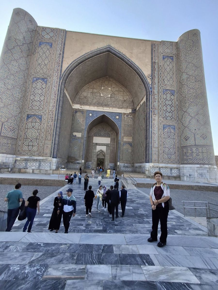 Hareket saatinin 15.00 yerine 16.00’ya alındığı bilgisi geldi. Etraftaki işyerlerinde birkaç küçük hediyelik aldık. Bilgi şöleninin (sempozyum) Özbekistan ayağındaki başkanı Prof. Dr. Marufjon Yuldashev (Marufcan Yoldaşev) “buraya kadar gelmişken Bibi Hatunu[4] ziyaret etmemek olmaz” dedi. Birkaç yüz metre ötede imiş Timur’un eşinin anıt mezarı. Oraya doğru hızlı adımlarla gidiyoruz. Muhteşem, anıt tarzı yapılar. Sanat ve mimari şaheseri. Türkiye’de Selimiye, Süleymaniye gibi anıt mimari örnekleri var. Ama Anıtkabir dışında şair, büyük sanat ve fikir adamları, devlet adamları için insanları kendine, bölgeye çekecek kadar ebat, zevk, estetik ve kimliği olan abide eserler yok denecek kadar az maalesef. Varsa da çok mütevazı. O nedenle çok meraklılar dışındaki halkın, insanların dikkatini çekmiyorlar.