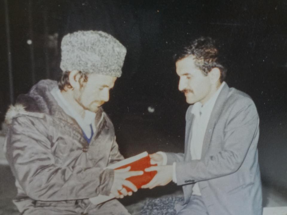 Resimde Kemal Çapraz Mustafa A Kırımoğlu ile ilk buluşması ve ilk röportajını yaptığı zaman, Kuran’ı Kerim ve Türk bayrağı hediye ederken.( Foto Kemal Çapraz arşivi) Kasım 1989 Akmescit-Kırım
